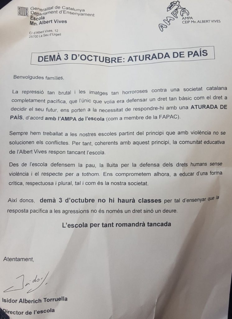 A compte gotes es van coneixent noves denúncies presentades davant els jutjats de la Seu d’Urgell i la Fiscalia de Menors de Lleida de pares i mares de l’escola pública Mossèn Albert Vives per un presumpte delicte d’incitació a l’odi a alumnes que cursen primària en el centre. En les darreres hores s’ha confirmat una altra acusació que també, en aquest cas, va adreçada al mateix col·legi que dirigeix, Isidor Alberich, alhora regidor de l’ajuntament de l’equip de govern que encapçala l’alcalde Albert Batalla. Alberich va explicar en una carta adreçada a tots els pares d’alumnes, dilluns passat, els motius de l’aturada de l’endemà, com es pot observar en el document que s’adjunta.