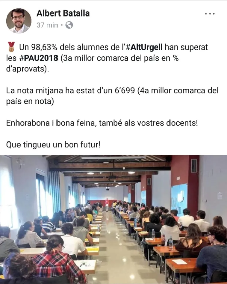 L’alcalde de la Seu d’Urgell, Albert Batalla, ha felicitat aquest dilluns a través de les xarxes socials als alumnes que van realitzar la setmana passada les Proves d’Accés a la Universitat (PAU) per “la bona feina” i per l’alt nivell d’aprovats.