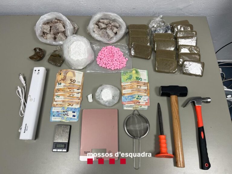 Finalment, l’endemà al matí, es va realitzar l’entrada i perquisició a l’habitació. A l’interior es va intervenir 1.630 grams de haixix, 700 grams de cristall d’èxtasis, 185 grams de pastilles d’èxtasis, un gram de cocaïna i una bossa amb un pols que seria substància de tall. A més, tenien retalls de plàstic per elaborar les bossetes de venda, una bàscula digital i altres eines relacionades amb el tràfic de drogues.