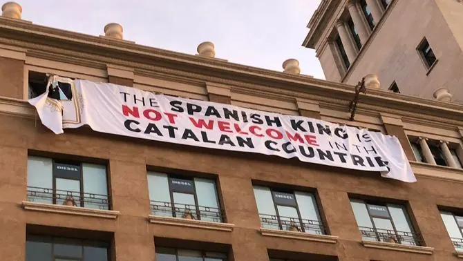 A la pancarta, d’uns quinze metres d’amplada, hi ha escrit en anglès: “El rei espanyol no és benvingut als Països Catalans”, amb una foto de Felip VI cap per avall. No hi apareix cap nom ni identificatiu de cap entitat o partit polític.