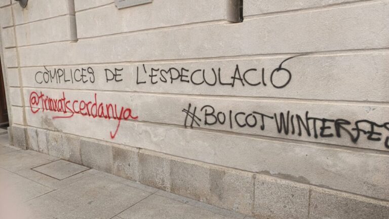 Aquest dilluns la façana de l’Ajuntament de Puigcerdà ha aparegut amb pintades contra l’especulació immobiliària i la manca d’habitatges a preus assequibles del municipi i de la resta de la Cerdanya.