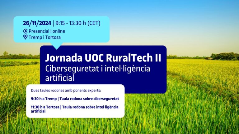 El dimarts 26 de novembre tindrà lloc la jornada UOCRuralTech, una trobada, organitzada per la Universitat Oberta de Catalunya, per debatre les oportunitats de la ciberseguretat i la intel·ligència artificial (IA) aplicades a la transformació digital del món rural. L’esdeveniment es realitzarà de manera simultània en dos punts del territori: a Trem (Pallars Jussà), a l’Epicentre, i a Tortosa, amb l’opció d’assistir també en línia, per afavorir la participació de persones de tot el territori.