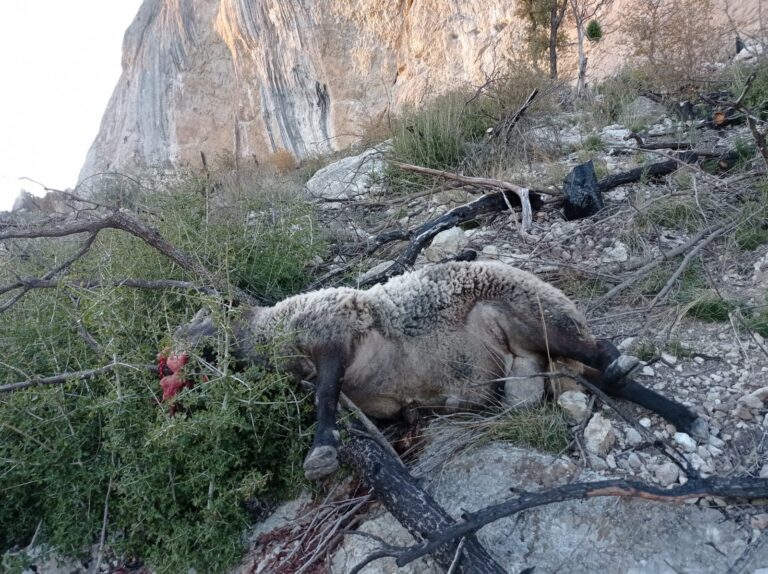 El cadàver d’una ovella, possiblement descarrilada es troba a l’espera que els agents forestals retirin els plàstics que han col·locat de l’indret on es va despenyar. En concret l’animal va caure al contrafort de Rumbau, al terme municipal de Peramola (Alt Urgell).